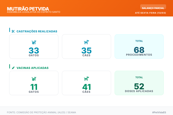 O mutirão integra a programação da Semana dos Animais da Ales, em referência ao Dia Nacional dos Animais (14 de março). A atividade começou na última segunda (9), com a Feira Pet, e segue até a próxima segunda-feira (16), com sessão solene em homenagem aos protetores de animais.