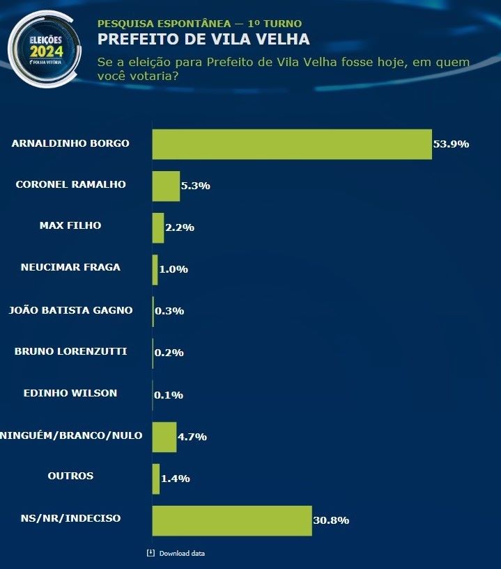 A preferência do eleitorado por Arnaldinho já aparece na resposta espontânea, onde 53,9% responderam que se o pleito fosse hoje, votariam em Arnaldinho. O prefeito de Vila Velha aparece em primeiro lugar não apenas pesquisa espontânea – aquela que reflete o voto já decidido – mas também em todos os possíveis cenários da pesquisa estimulada.