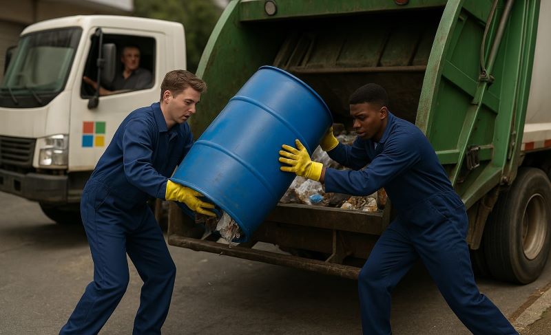 Enquanto o caminhão de lixo passa rapidamente pela rua, dois trabalhadores descem correndo, viram manualmente os latões azuis e jogam os resíduos para dentro. Às vezes cai um pouco no chão. Às vezes, nem tudo é levado — principalmente se for algo que “foge do padrão”: restos de móveis, pedaços grandes de madeira ou qualquer objeto que não caiba no latão.