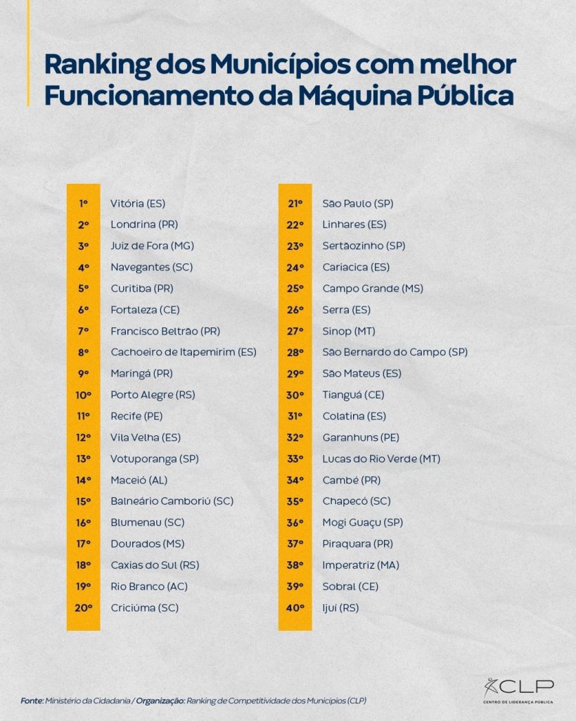 Segundo o CLP, o levantamento considera a capacidade dos municípios em planejar, articular e executar iniciativas e políticas públicas que promovam o bem-estar social, atendam às necessidades da população e construam um ambiente de negócios favorável.