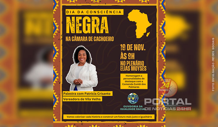 A Câmara de Cachoeiro, por meio de sua Ouvidoria da Igualdade Racial, realiza na próxima quarta, 19, às 9 horas, uma Sessão Solene em Alusão ao Dia da Consciência Negra. O evento, que acontece no Plenário da Casa, busca promover a reflexão, celebrar a cultura afro-brasileira e reforçar o compromisso com a igualdade e a justiça social.