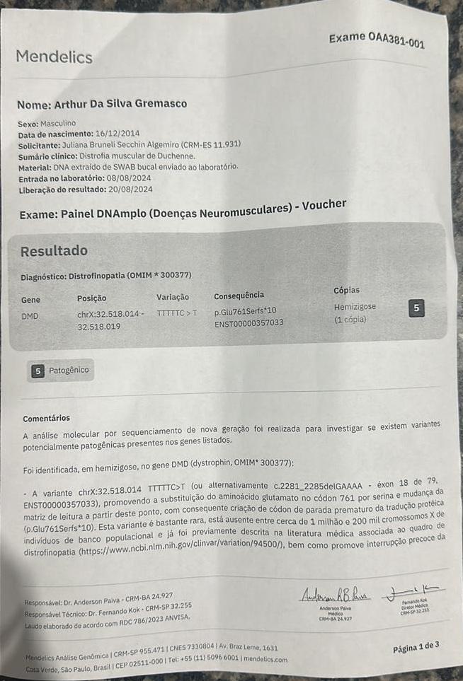 No Brasil o tratamento com o uso do Elevidys no Brasil para crianças até 7 anos de idade, o que torna ainda mais urgente a mobilização para que Arthur não perca a oportunidade oferecida no exterior.