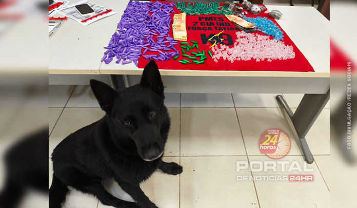 Diante do que foi constatado, os militares realizaram buscas e, com o apoio do cão de faro Black, localizaram uma sacola com drogas embaixo de um tanque de cozinha. O semovente também foi aplicado por toda a área e indicou a presença de ilícitos em outros pontos distintos, próximo a uma árvore.