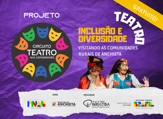 O projeto “CIRCUITO TEATRO NAS COMUNIDADES” é uma realização do Grupo de Teatro Rerigtiba, com o apoio da Prefeitura de Anchieta (GECPH) e recursos provenientes do Programa Nacional de Apoio à Cultura (PNAB), Ministério da Cultura e Governo Federal.