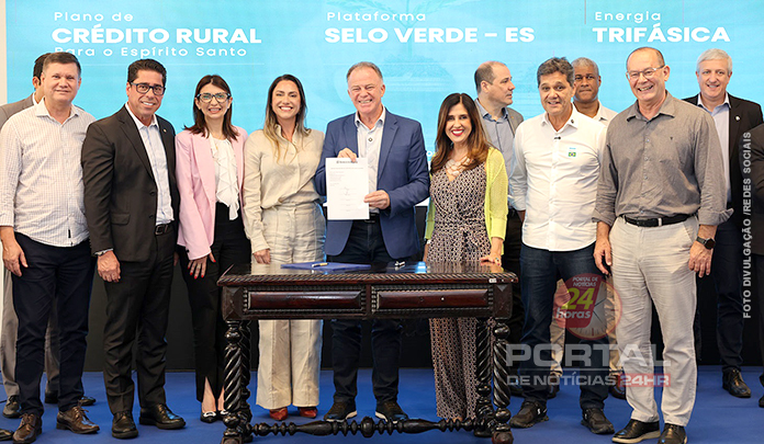 O governador Renato Casagrande lançou, nesta segunda-feira (04), o Novo Plano de Crédito Rural 2025/26 para o Espírito Santo, acompanhado da apresentação da Plataforma Selo Verde-ES e da assinatura do Projeto de Lei que autoriza o uso de crédito outorgado de ICMS para instalação de redes trifásicas no meio rural. O evento contou com a presença de autoridades, além de representantes do setor agropecuário, instituições financeiras e entidades de trabalhadores e produtores rurais.