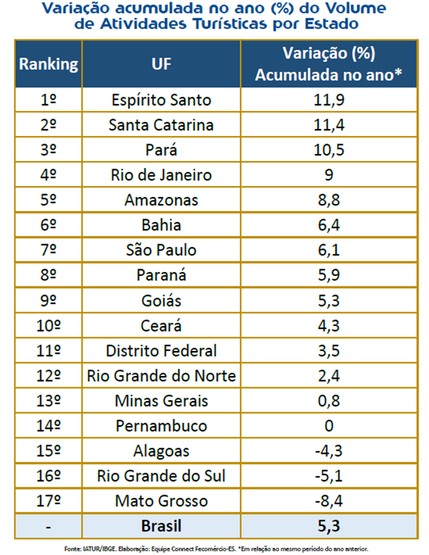 As análises são do Connect Fecomércio-ES (Federação do Comércio de Bens, Serviços e Turismo do Espírito Santo), com base nos dados de pesquisa do Índice de Atividades Turísticas (Iatur), realizada pelo Instituto Brasileiro de Geografia e Estatística (IBGE).