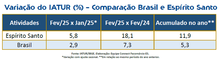 “No caso do turismo, isso permite entender se houve de fato um crescimento no setor ou se o resultado foi influenciado apenas por fatores sazonais. Com esse ajuste, o crescimento observado em fevereiro indica que o setor teve um desempenho acima do esperado para esse período do ano, o que representa um sinal positivo e consistente da recuperação e expansão do turismo capixaba. Esse resultado evidencia a capacidade do estado de estender a alta temporada de verão para além de janeiro, o que é fundamental para ampliar a movimentação turística em uma das épocas mais importantes do ano para o setor”, explicou o coordenador do Connect Fecomércio-ES.
