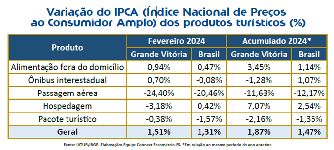 Em fevereiro, três dos cinco principais produtos turísticos monitorados apresentaram redução de preços na Grande Vitória. Apenas a alimentação fora do domicílio (0,94%) e as passagens de ônibus interestadual (0,70%) registraram leve aumento no período. Por outro lado, observou-se queda nos preços de hospedagem (-3,18%), pacotes turísticos (-0,38%) e, principalmente, passagens aéreas (-24,4%).
