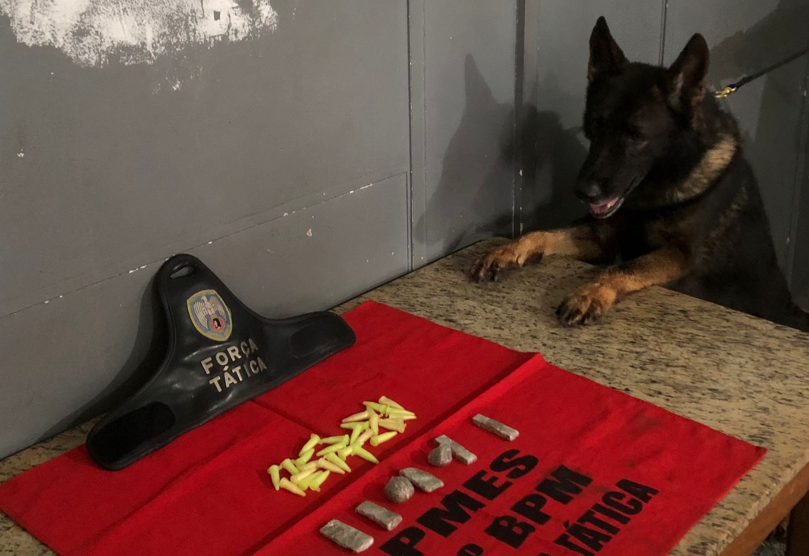 Ao se dirigir ao local, os policiais não avistaram nenhuma pessoa em atitude suspeita, porém, com a preciosa ajuda do semovente cão Messi, lograram êxito em localizar uma sacola, escondida em meio à vegetação, contendo 28 pinos de cocaína e 07 buchas de maconha.