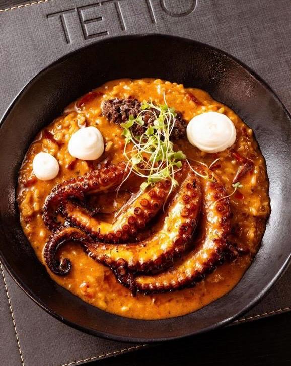 Uma outra opção para os paladares exigentes e de encher os olhos, é o Risoto de Polvo. Com chorizo espanhol, sofrito, tapenade de azeitonas, ciboulette e aioli. Irresistível! O cardápio dos pratos dos Tetto Rooftop Vitória é baseado no Tetto São Paulo, que tem à frente a chef Juliana Higa.