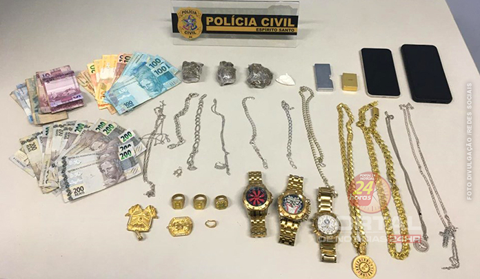 Durante as diligências, os policiais encontraram no quarto do suspeito três porções de maconha pesando, aproximadamente, 60 gramas, uma bucha de cocaína com cerca de 5 gramas, R$ 4.621,75 em espécie, dois aparelhos celulares, três relógios, um isqueiro, um dispositivo eletrônico em caixa dourada, além de joias e bijuterias — entre anéis, pingentes, cordões e pulseiras em tons dourado e prata.