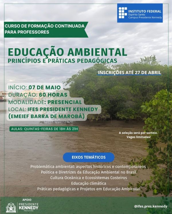 O Ifes Campus Presidente Kennedy está com inscrições abertas para o curso de extensão Educação Ambiental: princípios e práticas pedagógicas, voltado a professores que atuam no município de Presidente Kennedy.