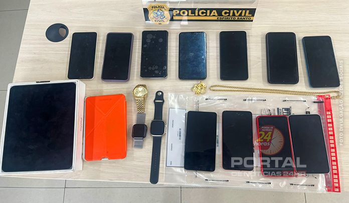 Durante as buscas, realizadas nesta terça-feira (08), os policiais localizaram uma grande quantidade de produtos eletrônicos, entre eles um celular Motorola Moto G24, um Moto G35, um Samsung Galaxy A55 e um Samsung Galaxy A06, todos com restrição de furto e roubo. O carro utilizado na ação criminosa também foi apreendido.