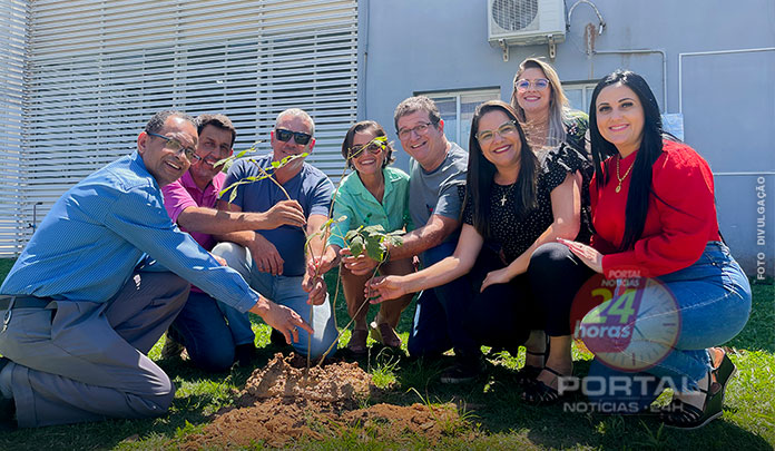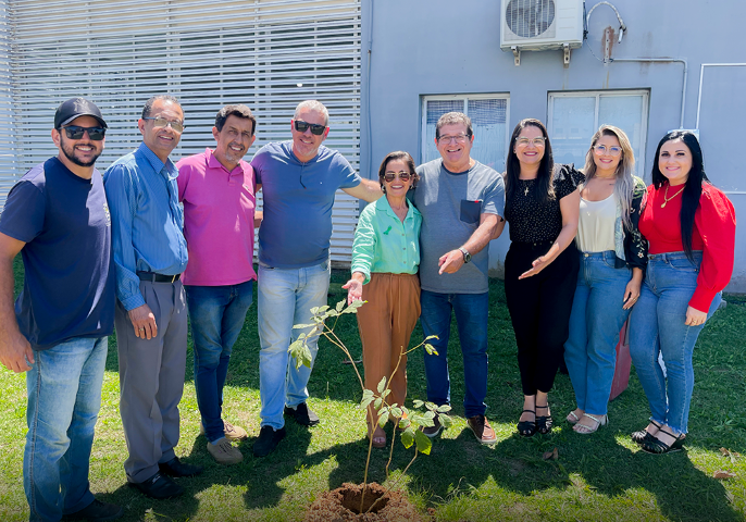 Prefeito realizou o encerramento simbólico das atividades com o plantio de duas mudas de ipês na área externa do prédio da Prefeitura, acompanhado da primeira-dama Samantha de Oliveira, do Secretário Municipal de Administração Carlos Augusto, e da assessoria de gabinete.