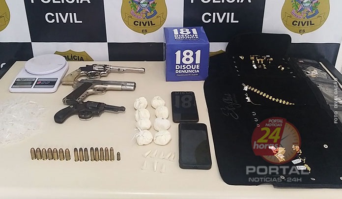 No local, a polícia apreendeu uma pistola Colt, calibre .45, um revólver, calibre 38, um revólver, calibre 32, oito munições calibre 38, sete munições calibre 45, uma munição calibre 32, além de uma balança de precisão, oito porções de cocaína, pesando aproximadamente 195 gramas, oito pinos de cocaína, 158 de pinos vazios utilizados para envase de cocaína e diversas peças de semijoias com etiquetas.