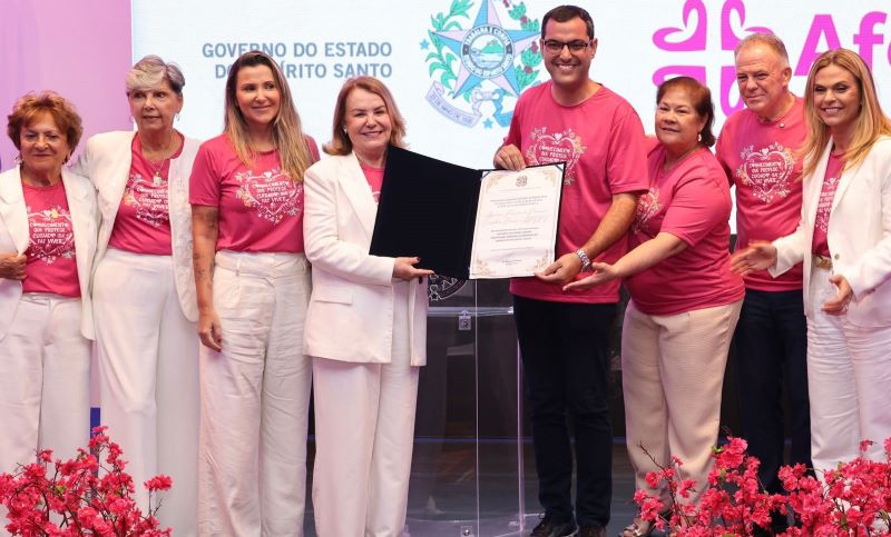 O deputado Dr. Bruno Resende, presidente da Comissão de Saúde da Assembleia Legislativa, entregou à Afecc – Associação Feminina de Educação e Combate ao Câncer a Lei 12.538/25, de sua autoria, que declara de utilidade pública essa instituição. A lei foi entregue à presidente da Afecc, Marilucia Dalla, na abertura da campanha Outubro Rosa, no Palácio Anchieta, nesta quarta-feira (01), às 18h, na presença do governador Renato Casagrande e de demais autoridades e representantes da sociedade civil que compareceram à solenidade.