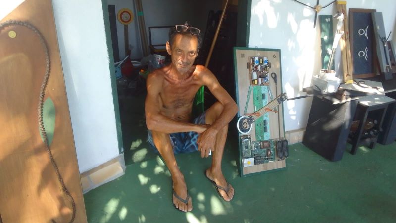 Hoje, em Porto Grande, vive cercado pela natureza na Pousada Sol Maior, em um cenário paradisíaco que se tornou também uma espécie de ateliê a céu aberto. Ali ele transforma o que muitos descartam em peças únicas de arte: raízes, galhos, metais, materiais reutilizados e elementos naturais ganham nova vida em suas mãos. Não é difícil também vê-lo fazendo composições musicais, dom que o acompanha desde a época em que comandava a aclamada casa de shows “Atrás das Bananeiras“, em Juiz de Fora; ou que organizava festivais musicais, como o Sol Maior, em Marataízes, nos anos 1980.