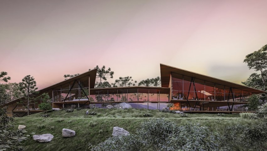 “Ainda existe uma rocha natural no terreno, que foi utilizada como base para a passarela elevada, preservando o terreno na sua forma original. As principais características do projeto são a estrutura metálica aparente, as rochas e os telhados inclinados”, explica a estudante do nono período de Arquitetura e Urbanismo da Univali – Universidade do Vale do Itajaí, em Balneário Camboriú.