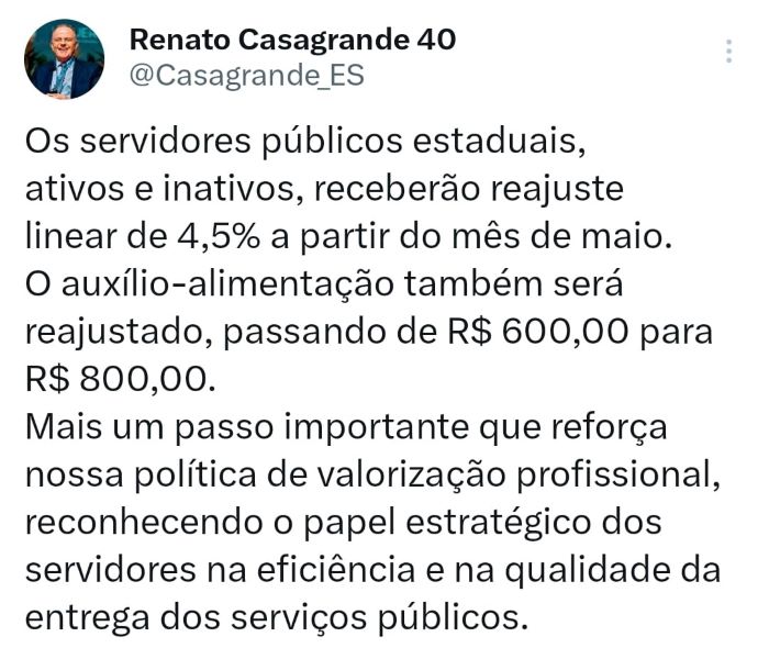 O governador Renato Casagrande anunciou, pelas redes sociais, um aumento linear de salários para os servidores públicos estaduais. O reajuste será de 4,5%, alcançando os servidores ativos e inativos. Cerca de 55 mil profissionais serão beneficiados com esse aumento.