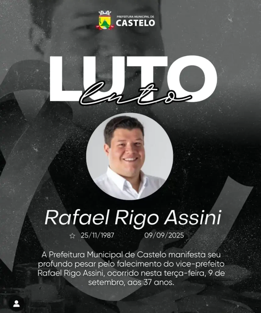 A cidade de Castelo, no Sul do Espírito Santo, amanheceu de luto nesta terça-feira (9) com a notícia do falecimento repentino do vice-prefeito Rafael Rigo Assini. Ele deu entrada em um hospital local com dores no peito, vindo a óbito cerca de 20 minutos depois. A causa provável da morte, embora não confirmada oficialmente, é um infarto fulminante.