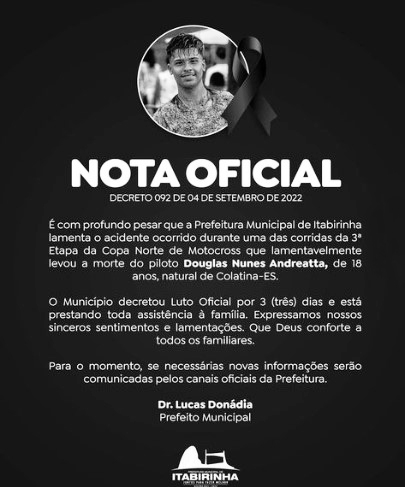 O piloto colatinense Douglas Nunes Andreatta, de 18 anos, morreu durante a 3ª Etapa da Copa Norte de Motocross em Itabirinha, Minas Gerais, na tarde deste domingo (4). A tragédia aconteceu durante uma das corridas da 3ª Etapa da Copa Norte de Motocross.