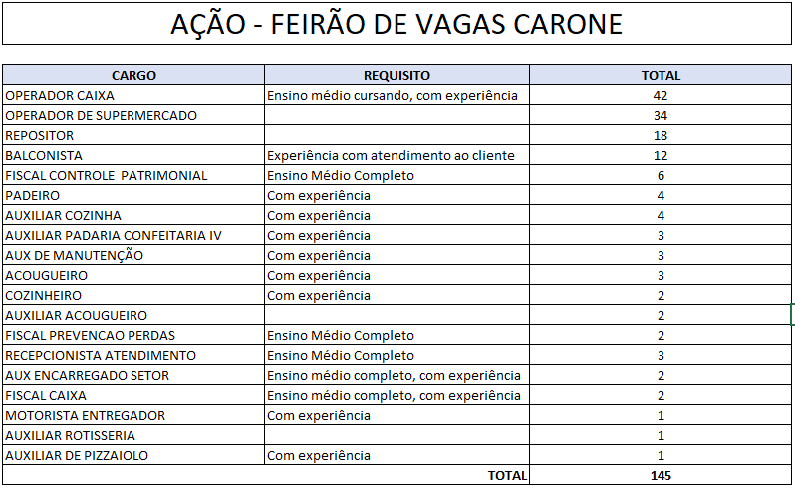 Para concorrer a uma das 145 vagas em aberto e ser contratado para trabalhar em uma loja dos Supermercados Carone, o candidato deve comparecer ao Terminal de Itaparica dentro do horário de atendimento, levando comprovante de residência (para provar que reside no município), documentos pessoais (RG e CPF ou CNH) e Carteira de Trabalho. Quem tiver currículo também deve apresentá-lo, para facilitar o cadastro e o encaminhamento. Já a seleção e a contratação serão feitas pela equipe de Recursos Humanos do próprio Grupo Carone.