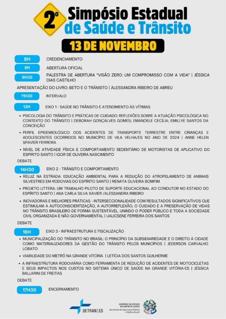 O Departamento Estadual de Trânsito do Espírito Santo (Detran|ES) anuncia a abertura das inscrições para o 2º Simpósio de Saúde e Trânsito, que neste ano aborda o tema “Visão Zero”. O Simpósio será realizado no dia 13 de novembro, na sede do Detran|ES, em Vitória. As inscrições são gratuitas e devem ser feitas pelo site www.detran.es.gov.br até o dia 10 de novembro.